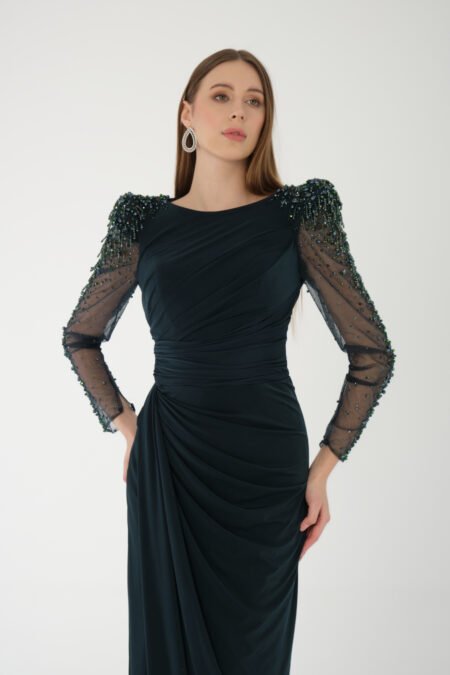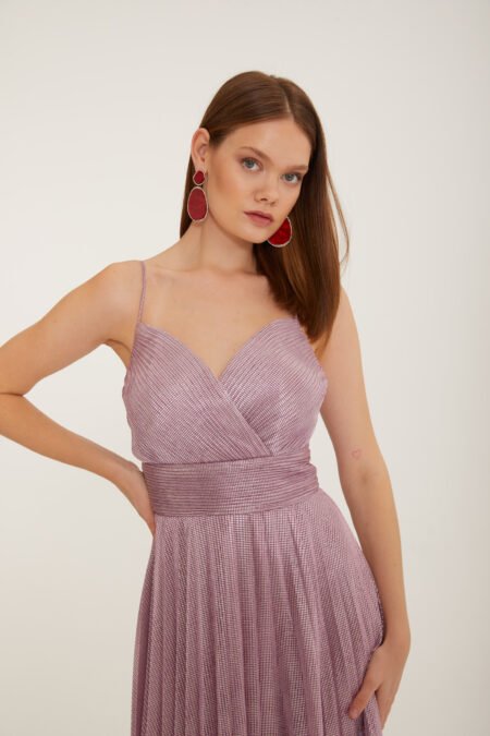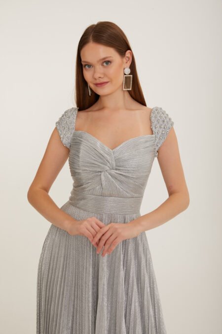 Description Details Lame Fabric Shimmery metallic fabric with a soft, flowy drape This elegant evening gown features a sweetheart neckline with gathered detailing at the bust, paired with delicate beaded cap sleeves for a touch of glamour. The wide waistband accentuates the silhouette,while the pleated full-length skirt flows gracefully to […]