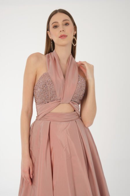 Description Details Taffeta Fabric This dress features a halter neckline with a hand-embellished bodice, a stylish cut-out design at the waist, and a full-length pleated skirt for an elegant flow. Beaded Bodice with Criss-Cross Halter Cut-Out Waist Detail Long Dress Floor Length Evening Dress Secure zipper A-line Info And Care […]