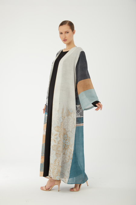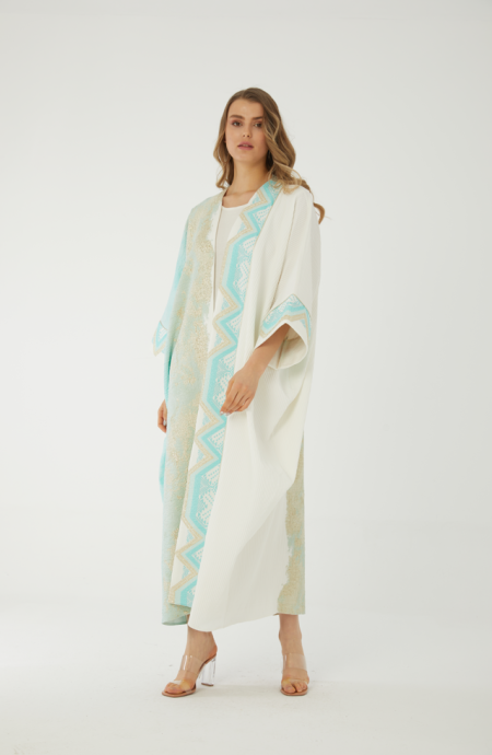 Description Details   crepe fabric simple Bisht Abaya silver turquiose gold Info and Care Color: silver , gold , turquise Neck type: halter Apparel type:  bisht abaya Model height: 165 cm Size shown in image: 38 Model measurements Bust: 89 Waist: 65 Hips: 94 Product Code: Sku:230205/36