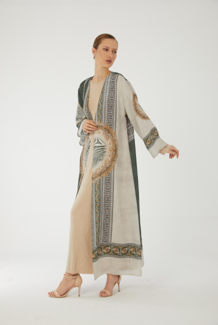 Description Details   crepe fabric simple Bisht Abaya L green   Info and Care Color:L green Neck type: halter Apparel type:  bisht abaya Model height: 165 cm Size shown in image: 38 Model measurements Bust: 89 Waist: 65 Hips: 94 Product Code: Sku:230205/32