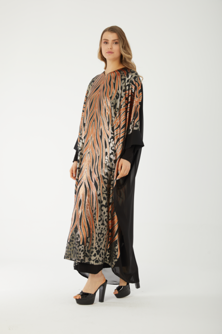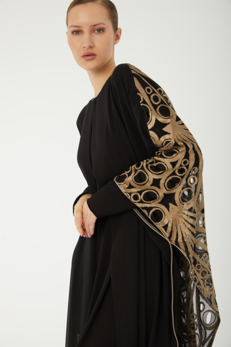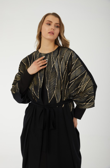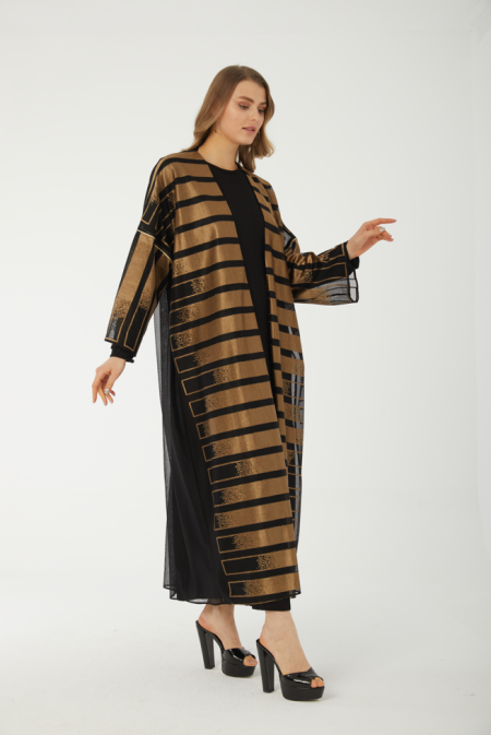 Description Details   crepe fabric simple Bisht Abaya silver & gold   Info and Care Color: silver , gold Neck type: halter Apparel type:  bisht abaya Model height: 165 cm Size shown in image: 38 Model measurements Bust: 89 Waist: 65 Hips: 94 Product Code: Sku:230205/23