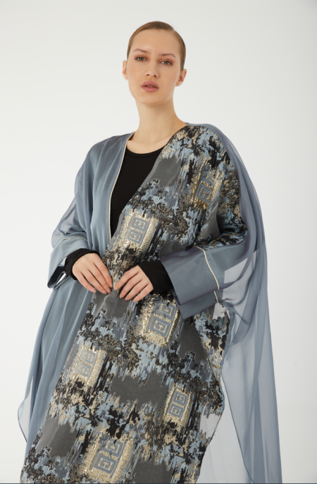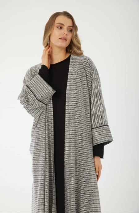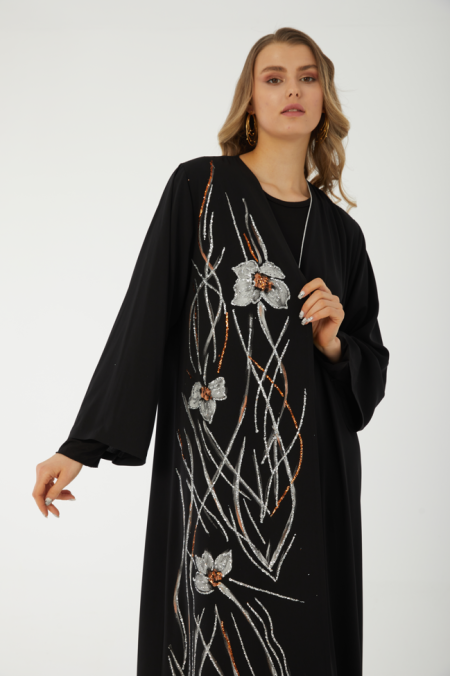 Description Details   crepe fabric simple Bisht Abaya silver   Info and Care Color: silver Neck type: halter Apparel type:  bisht abaya Model height: 165 cm Size shown in image: 38 Model measurements Bust: 89 Waist: 65 Hips: 94 Product Code: Sku:230205/25