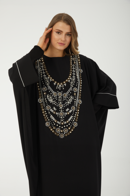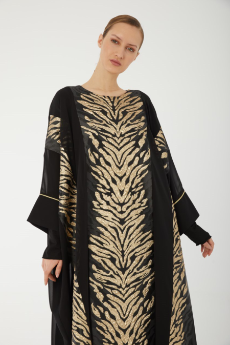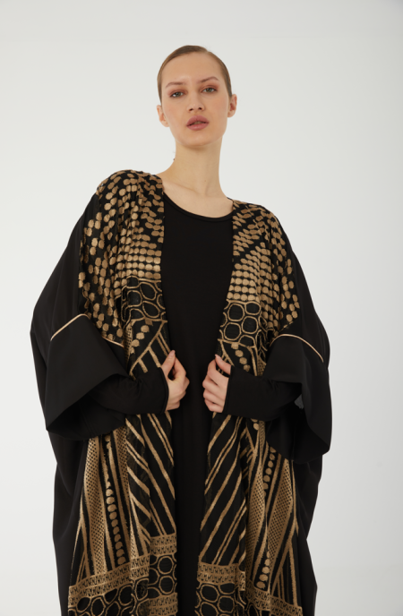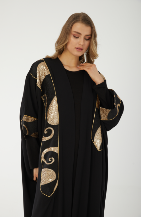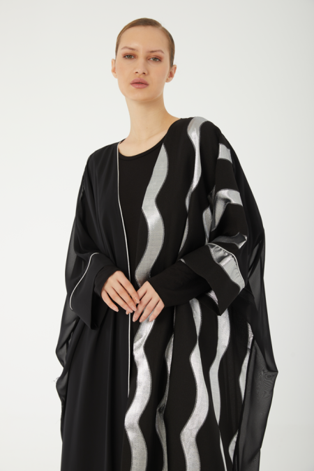 د.إ 1,075.00Original price was: د.إ 1,075.00.د.إ 700.00Current price is: د.إ 700.00.Description Details crepe fabric simple Bisht Abaya silver & gold Info and Care Color: black , silver Neck type: halter Apparel type:Â bisht abaya Model height: 165 cm Size shown in image: 38 Model measurements Bust: 89 Waist: 65 Hips: 94 Product Code:Â Sku:230205/21